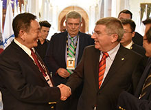 中國自行車運動協會主席崔大林向國際奧委會主席巴赫介紹 泰山瑞豹自行車