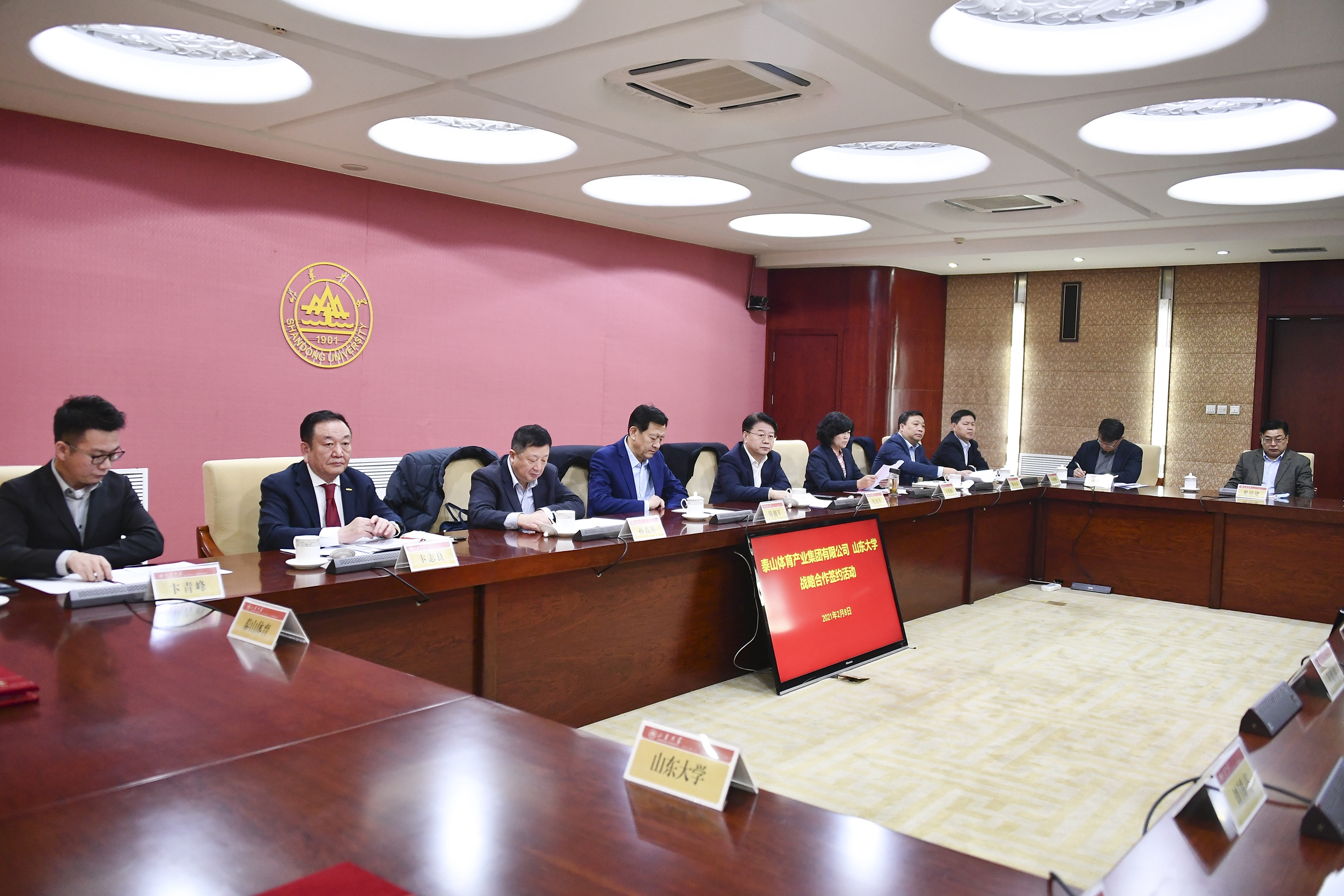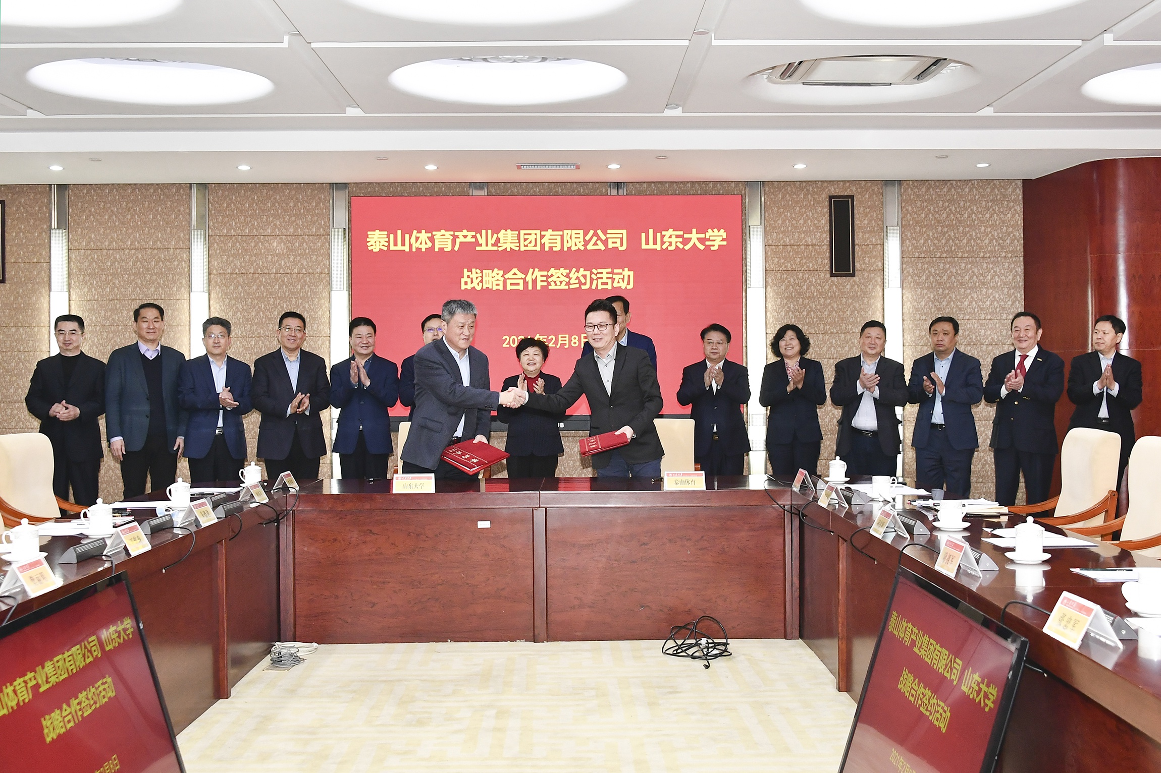 為積極建設“體育強國”、“健康中國”、“健康山東”,努力實現產教融合與產學研深入合作,2021年2月8日,泰山體育產業集團與山東大學戰略合作簽約儀式在山東大學中心校區隆重舉行。山東省體育局黨組成員、省體育總會專職常務副主席隋擁軍,山東省工信廳二級巡視員張忠軍,山東省科技廳總工程師孫高祚,省體育局體育產業發展服務中心主任翟培建,山東省科技廳張大瑞,德州市副市長馬俊昀,樂陵市委副書記、市長陳光春,山東大學黨委副書記、校長樊麗明,全國政協委員、泰山體育產業集團有限公司董事長卞志良等領導出席儀式。簽約儀式由山東大學黨委副書記王君松主持。
