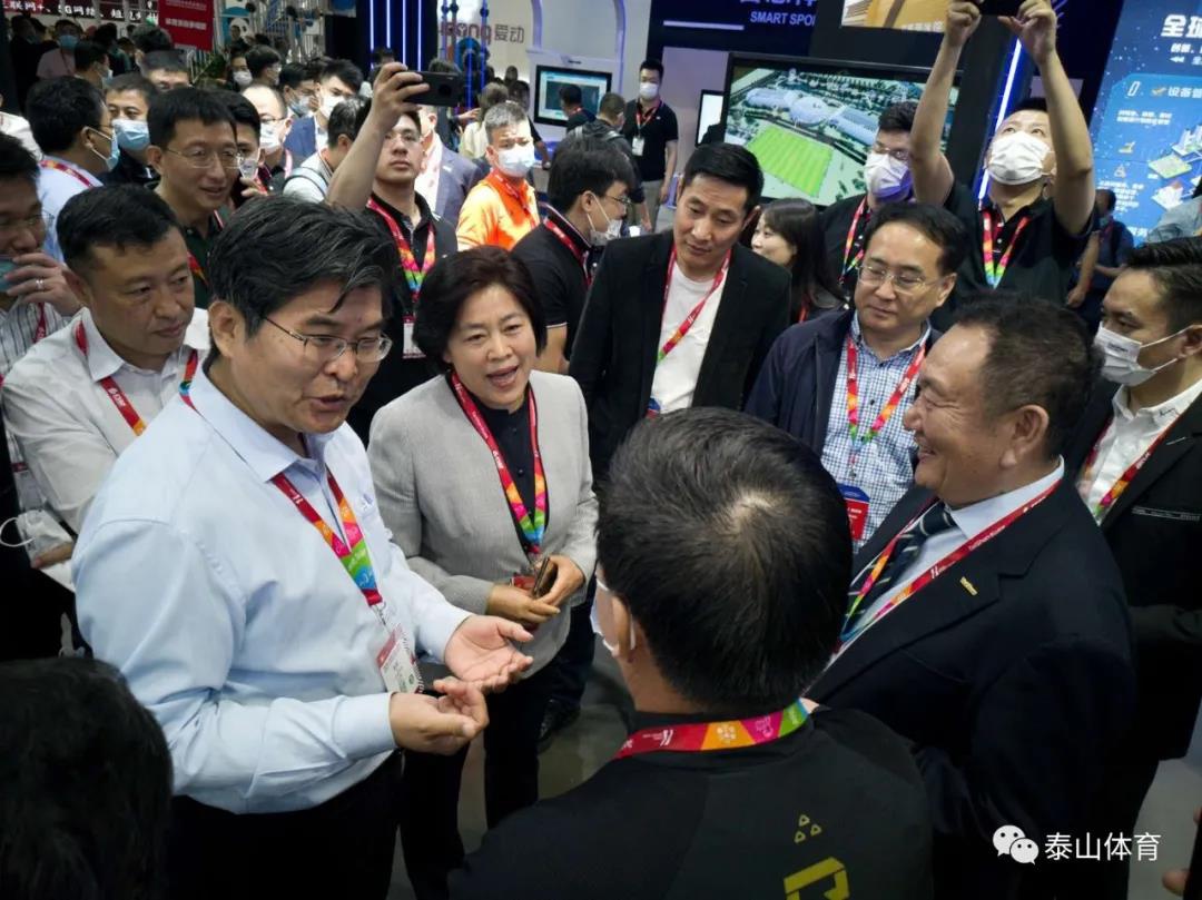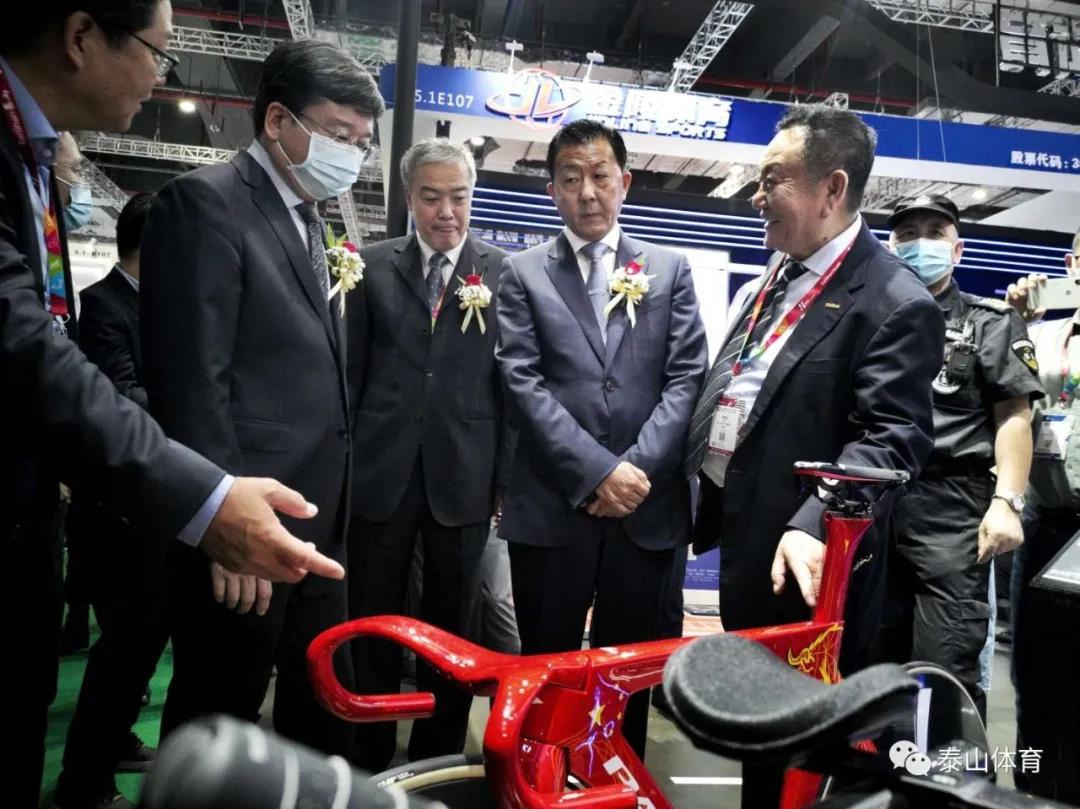 國家體育總局副局長李穎川、上海市副市長陳群、國家體育總局體育器材裝備中心主任孫為民、上海市體育局局長徐彬在泰山體育產業集團卞志良董事長陪同下參觀泰山體育展廳。