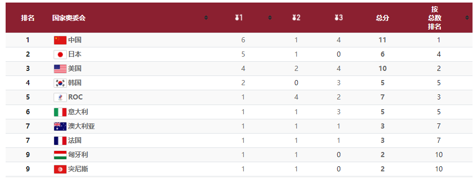 2021年7月25日,東京奧運會中國軍團以6枚金牌位居獎牌榜首位。