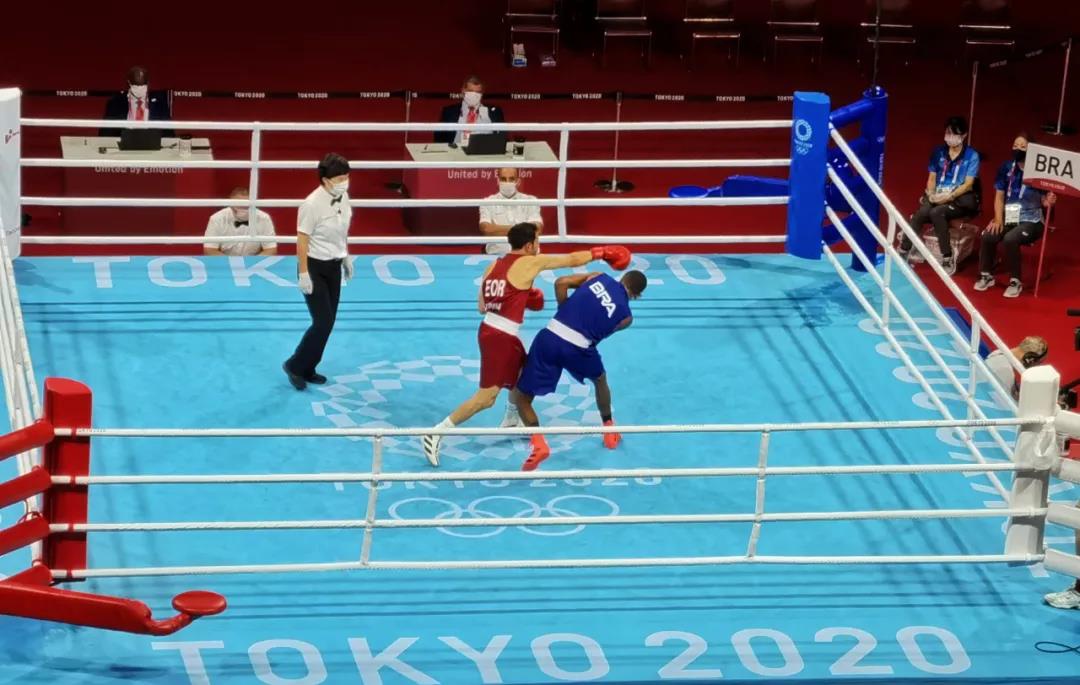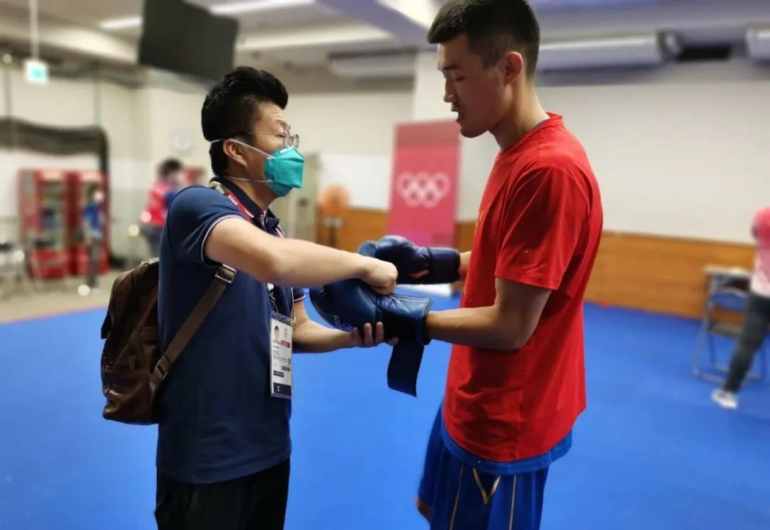 東京奧運會拳擊熱身館,泰山體育工作人員幫助運動員穿戴拳擊手套