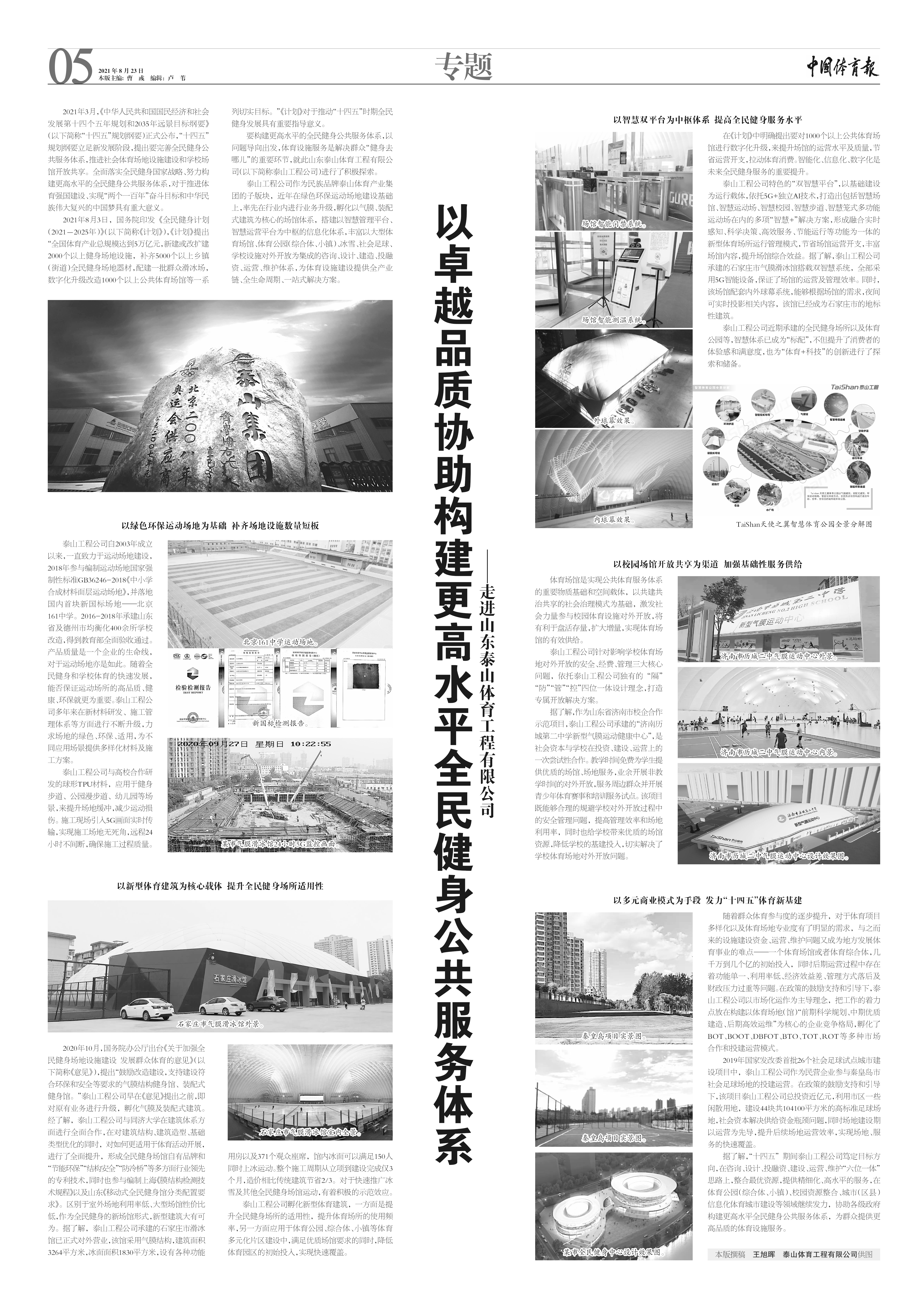 2021年8月23日,《中國體育報》整版刊載《以卓越品質協助構建更高水平全民健身公共服務體系——走進山東泰山體育工程有限公司》。