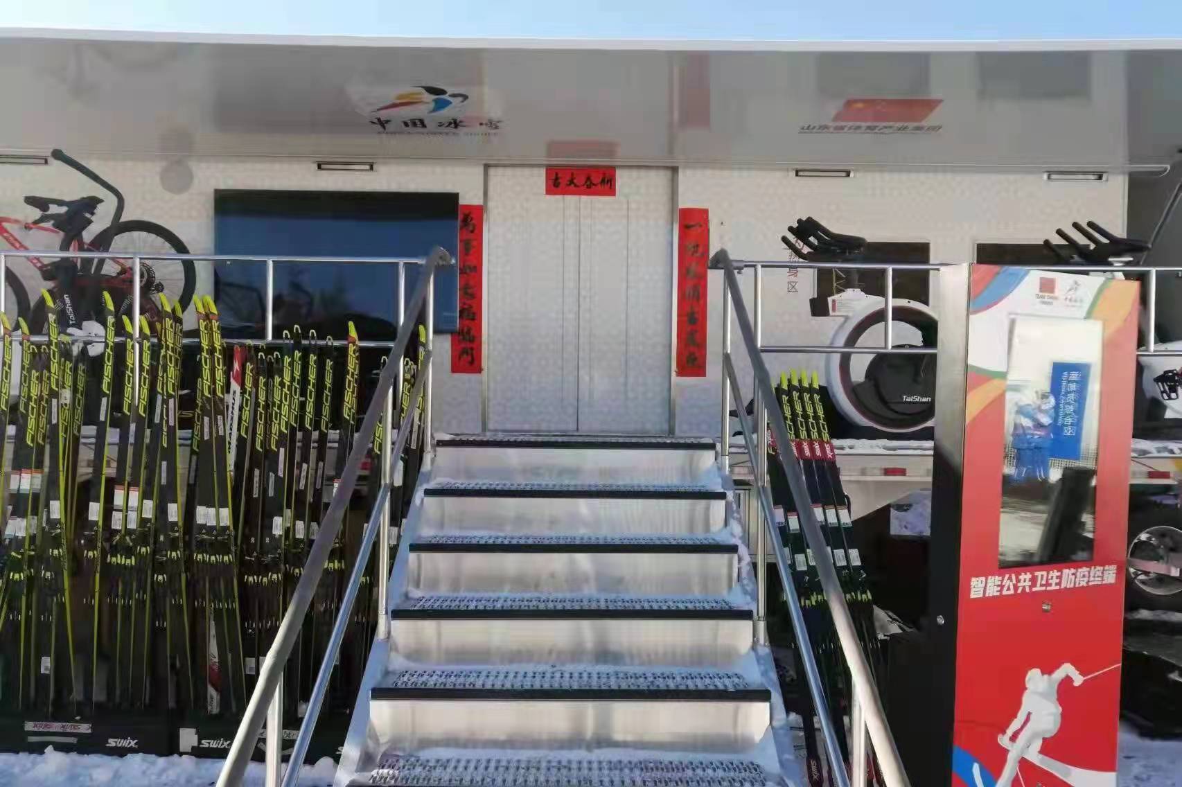 在保障的一個多月里,雪蠟車為我國越野滑雪隊的所有隊員提供打蠟服務,國家越野滑雪隊領隊、教練、打蠟師、運動員等都對雪蠟車交口稱贊,特別是對車輛的低碳環保、智能控制、打蠟臺的新穎設計、工作臺照明、車廂配飾、科學智能的健身區以及空調新風系統等給予高度評價。每天都有運動員在中國雪蠟車健身區使用器材進行鍛煉,進行賽前熱身和賽后體能恢復。健身區擁有泰山體育開發的具有自主知識產權的消殺防疫設備,以及具備運動員一站式自助體質檢測、智能專家評估、自動生成運動指導于一體的運動員評測、鍛煉的健身設備設施。這些器材設施使用了泰山體育自主研發的、擁有獨立知識產權的體育專用AI芯片。同時,泰山體育還為雪蠟車配備了我國首個登上奧運賽場的自主運動自行車品牌——“泰山瑞豹PARDUS”高端運動自行車,用于運動員熱身和體能服務。