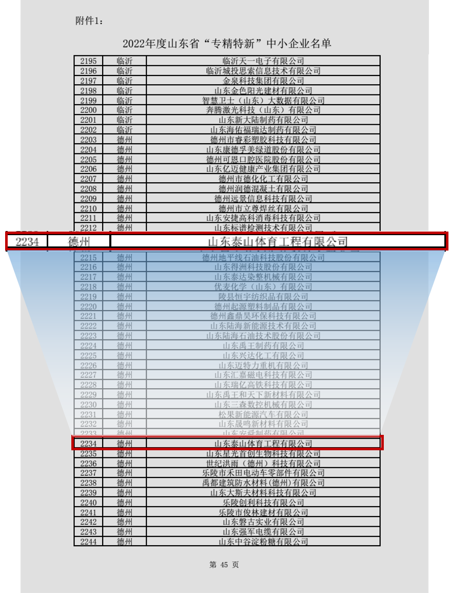 近日,山東省工業和信息化局公布通過復核的山東省“專精特新”中小企業,山東泰山體育工程有限公司(以下簡稱:泰山工程)榮譽上榜。