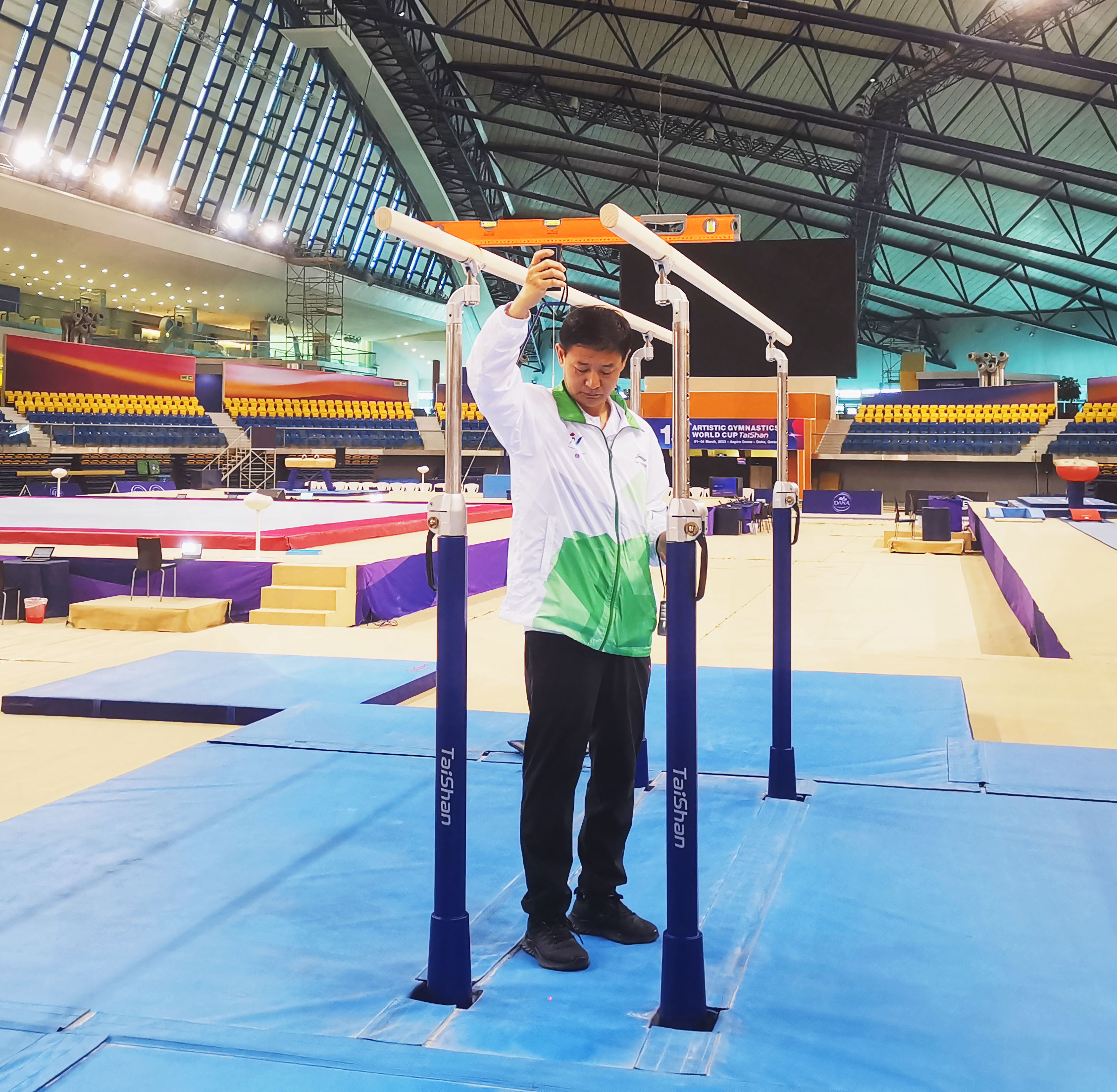 在精彩的賽事背后,離不開泰山體育團(tuán)隊(duì)的默默付出。泰山體育專業(yè)服務(wù)保障團(tuán)隊(duì)駐扎賽場全程守護(hù),為大賽保駕護(hù)航。賽前,他們連續(xù)日夜奮戰(zhàn),如期完成訓(xùn)練場館、熱身場館、比賽場館每件器材的安裝、調(diào)試,檢測工作,為比賽做好充分保障;賽中,泰山服務(wù)人員30秒內(nèi)即可完成高低杠的升杠降杠,保證了比賽的流程進(jìn)行。泰山保障團(tuán)隊(duì)以高效、精準(zhǔn)、專業(yè)的表現(xiàn)震驚全場,贏得了極高贊譽(yù)。