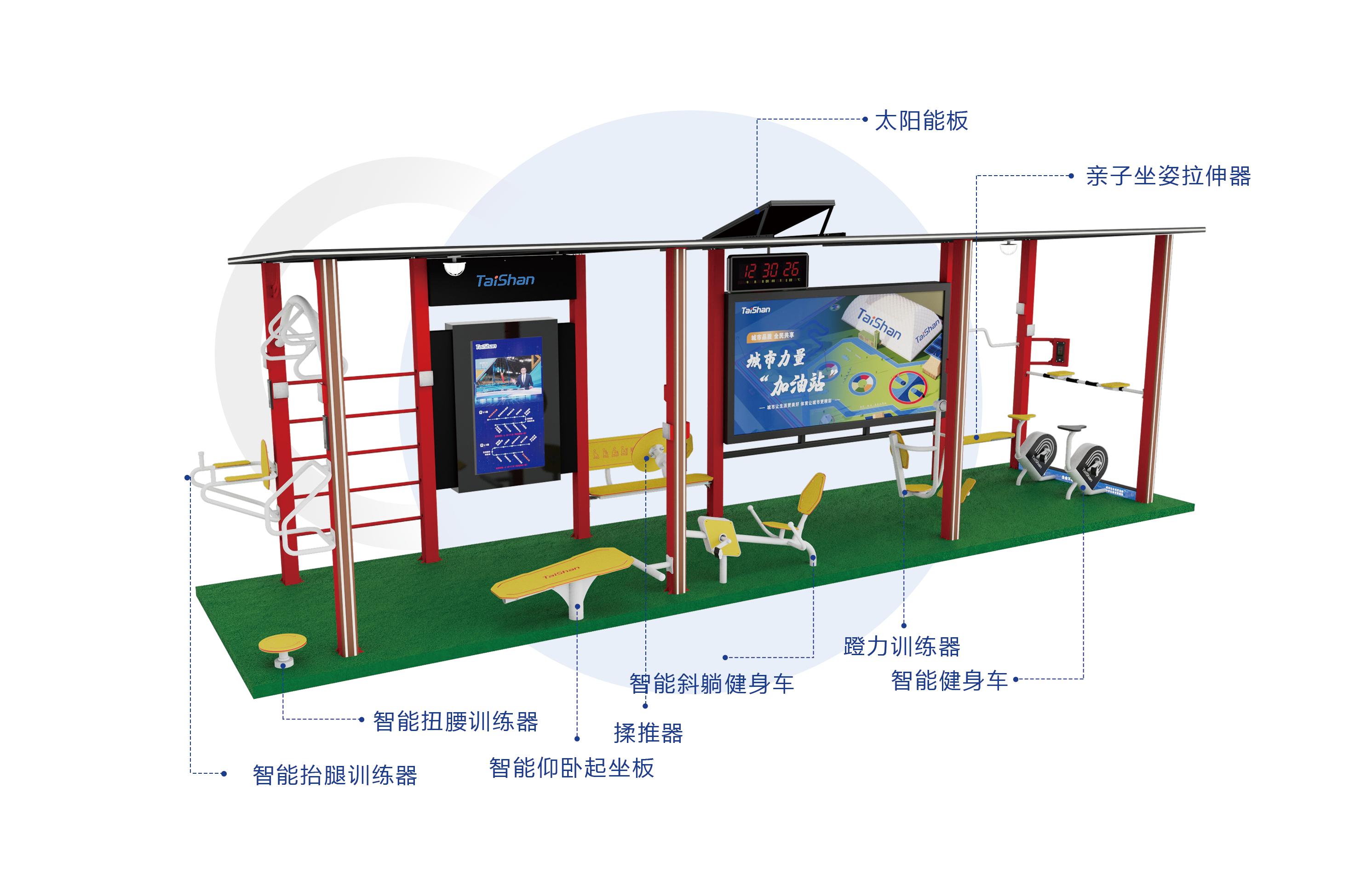 綜合健身公交站是由泰山體育完全自主研發(fā)設(shè)計(jì),適用于城市公交候車區(qū)域的“城市力量加油站”。綜合健身公交站配備多種健身項(xiàng)目,能夠根據(jù)城市需要設(shè)計(jì)不同健身項(xiàng)目與功能的移動(dòng)室外健身驛站。依托物聯(lián)網(wǎng)+互聯(lián)網(wǎng)和5G技術(shù),能夠充分發(fā)揮城市運(yùn)動(dòng)新型體育服務(wù)綜合職能,為運(yùn)動(dòng)人群提供更多科學(xué)健身指導(dǎo),為城市居民打造更健康的生活方式。公交候車亭在城市的廣泛使用,為乘客在侯車時(shí)提供躲避日曬雨淋的短暫場(chǎng)所,隨著城市的發(fā)展以及科技的進(jìn)步候車環(huán)境大為改觀,綜合健身公交站已經(jīng)成為城市一道靚麗的風(fēng)景,多功能化、智能化候車亭將緩解候車時(shí)的焦慮情緒,改善人們出行的愉悅心情更是提高社會(huì)和諧的有效手段。